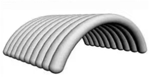 氣肋式膜結構是一種采用高壓氣肋作為支承體系的充氣膜結構,通過將多根氣肋連接成整體的方式創造出使用空間,具有輕質便攜、可快速運輸、低耗能、安全可靠等優點。