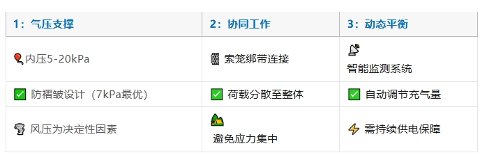 氣肋相互正交組成網格狀骨架,覆蓋膜材后形成類穹頂結構,抗風載能力顯著提升,多用于氣候復雜地區的建筑。