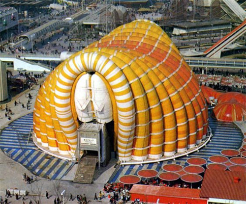 富士館采用氣肋式膜結構,結構跨度50m。該館由16根直徑4m、長78m的拱形氣肋圍成,氣肋間每隔4m用寬500mm的水平系帶把他們環箍在一起。呈半圓拱形,最高點向外突出7m。