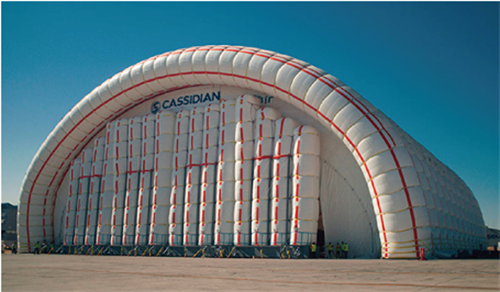 HangarH54Getafe充氣機庫)于2013年6月建造完成,工期為6個月。其凈寬為54m,凈長為110m,凈高為23m,管徑約為5m,實用面積為6000m2,允許容納2架大型飛機(如空客A310、空客A400M、波音707等)。從電腦或智能手機可以實時訪問壓力、風速、電機功率、能源消耗等相關參數。結構設計時,使用脊帶加強每根氣肋的剛度,從而顯著降低了膜面應力,使用肋帶、箍帶、豎向帶和交叉帶連接多根氣肋,從而實現了跨度大、承載性能高的目標。機庫前門采用可移動的充氣圓柱組合而成。